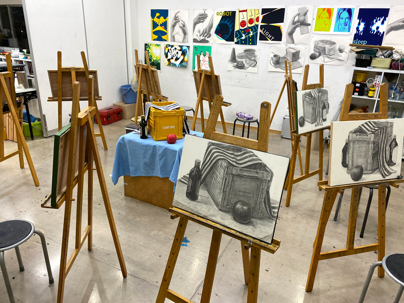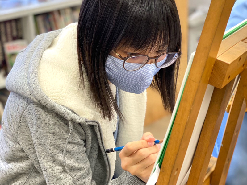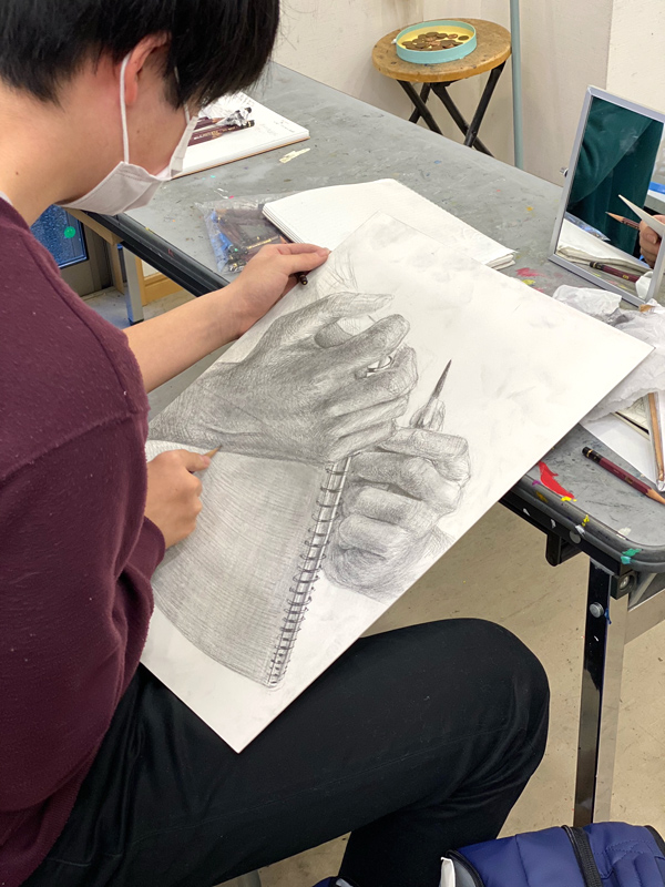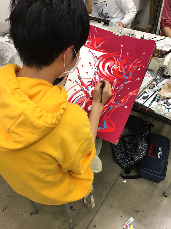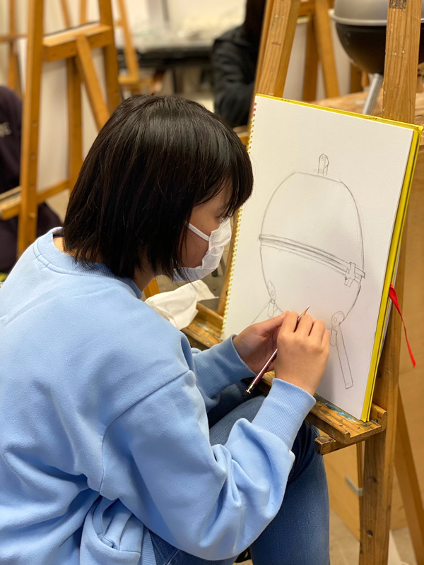 美術大学や各大学美術科の受験を前提としたクラスです。より専門的且つ合格に必要な技術を身につけることを目的とします。各科に応じたデッサンや平面構成、油彩、水彩(アクリル)等の課題を行い、どういった問題にも対応できる力を身につけていきます。試験問題は毎年変わっていくものなので、それに対応できる応用力が必要になります。一つの課題を繰り返すだけでなく、いろいろな技術を獲得していくと同時に受験に必要な力を身につけていくクラスです。